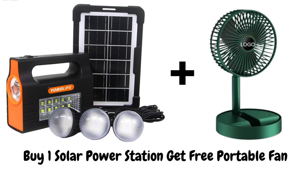 Portable Solar Home Energy Power System with Solar Panel LED Light. It boasts long battery life, can charge phones, and comes with 3 light bulbs to brighten your surrounding. Get a free Telescopic Foldable Fan if you buy before countdown hit Zero.